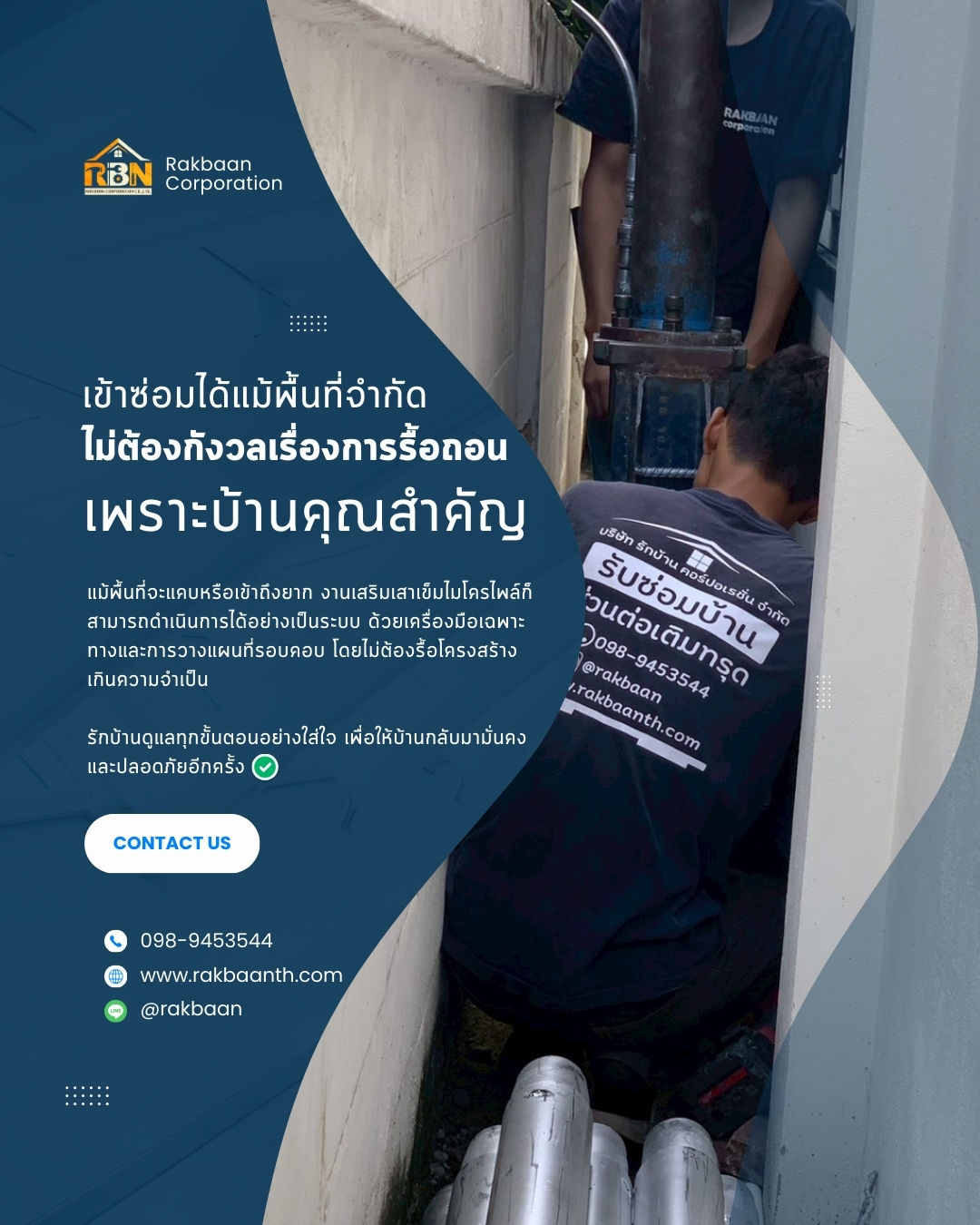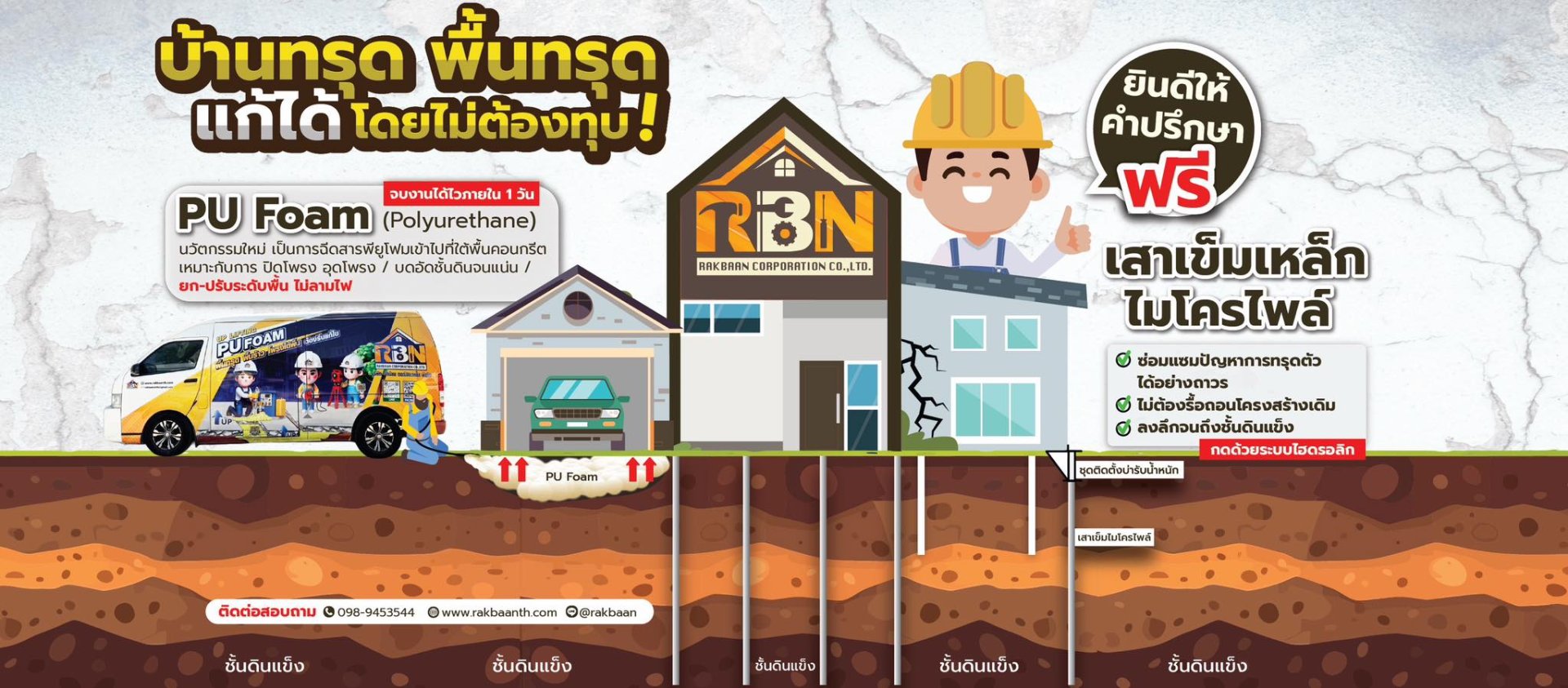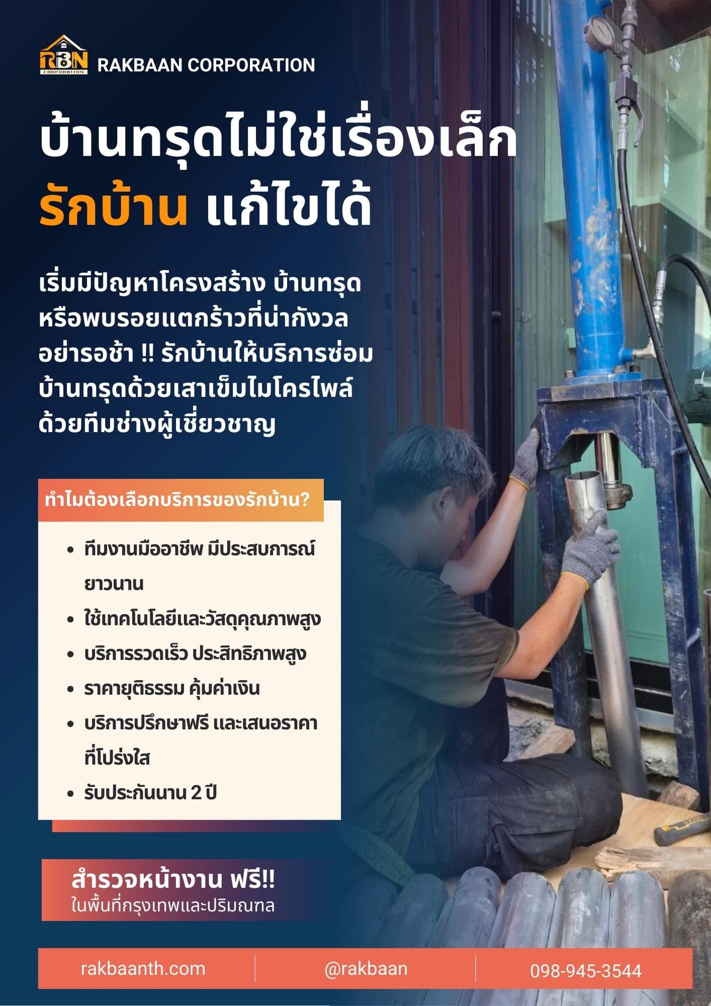 เป็นผู้ให้บริการ ด้านการซ่อมแซม ฐานรากที่มีปัญหาการทรุดตัว โดยใช้เสาเข็มไมโครไพล์กดด้วยระบบไฮดรอลิก ที่มีมาตรฐานให้มีความมั่นคงและแข็งแรง